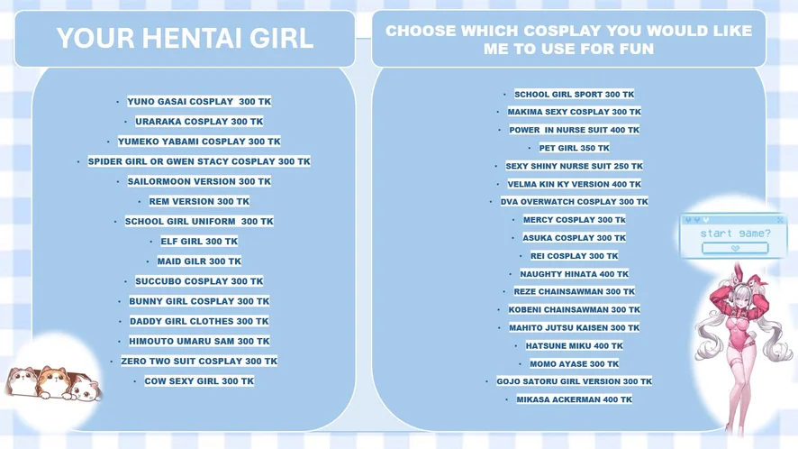 Doggy style, Ahegao, Spanking, Finger, Fodfetich, Deepthroat, Sexlegetøj, Onaniinstruktion, Rollespil, Blowjob, Onani, Brystsex, Knebling, Sprøjt, Kameltå, Cosplay, Cuckold, Dildo eller vibrator, Rygning, Olieshow, Hæle, Upskirt, Creampie, Facesitting, Facial, Blottelse, Ydmygelse, Brystvortelegetøj, Nylon, Orgasme, Latex, Hardcore, Topløs, Cowgirl, Læder, Dirty talk